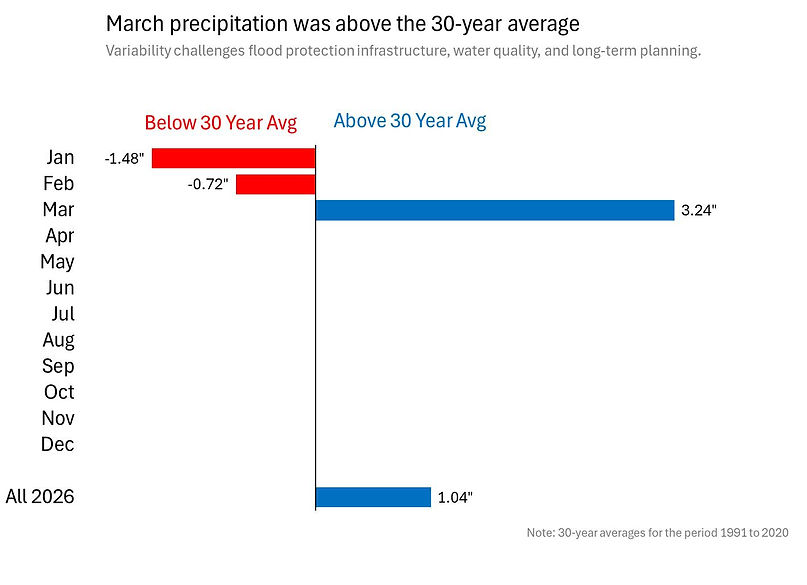 After a drier start to the year, March precipitation came in 3.24 inches above the 30-year average—pushing 2026 overall above average by 1.04 inches so far.