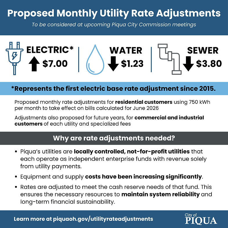 PIQUA - Piqua City Commission will consider three proposed utility rate adjustments at upcoming public meetings, with the first reading scheduled for Tuesday, April 7. The meeting begins at 5 p.m. at the Municipal Government Complex, 201 W. Water St.